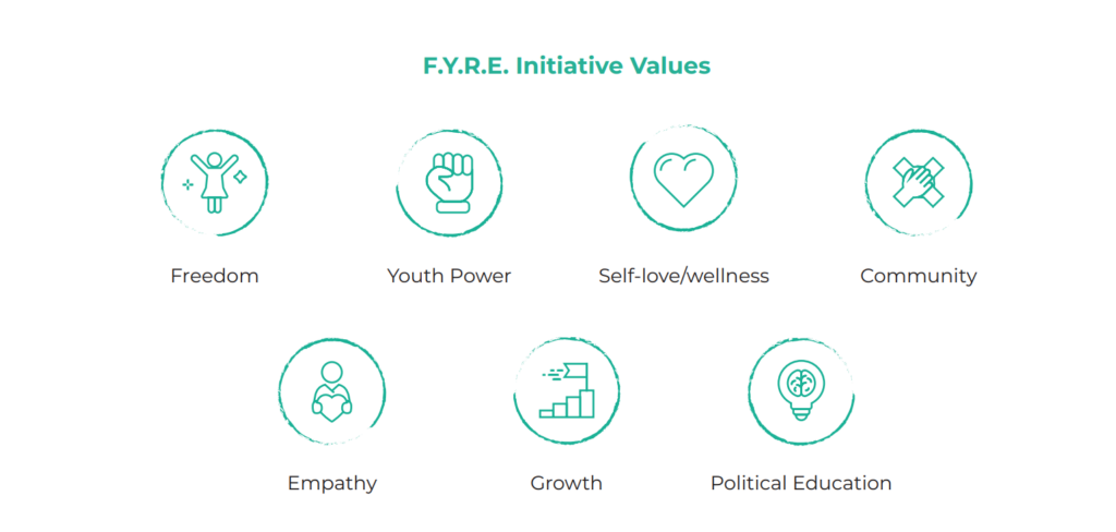The first few weeks of the program focus on educating Igniters on topics such as personal power, healthy relationships, and conflict resolution. They also come to better understand issues of racism and sexism and how intersectionality informs their identity. The program sessions become a space for Igniters to examine their knowledge of these topics and share their personal experiences. Through exercises with F.Y.R.E. Initiative program staff, participants build a sense of self, empowerment, and resilience through controlling their lives.
