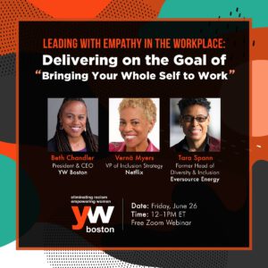 On June 26, 2020, over four hundred participants came together for a lunchtime webinar to discuss how business leaders can prioritize more equitable outcomes in their COVID-19 reopening plans and in their workplace in general. The webinar, titled “Leading with empathy in the workplace: Delivering on the goal of ‘bringing your whole self to work,'” encouraged us to challenge the commonly held notion that we must “leave our personal problems at the door.” Beth Chandler, YW Boston’s President & CEO, moderated a panel with special guests Vernā Myers, VP of Inclusion Strategy at Netflix, and Tara Spann, former Head of Diversity & Inclusion at Eversource Energy. Below are some highlights from this webinar along with a full recording of the event.